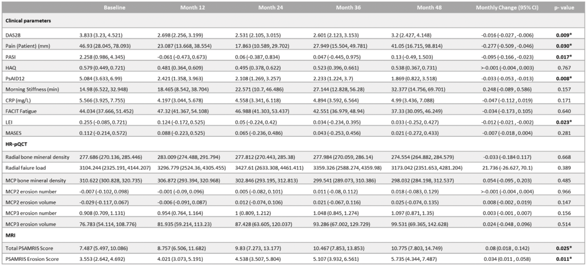 Conclusion: In our study, secukinumab demonstrated excellent long-term tolerability and clinical efficacy across all major disease domains over 48 or more months, with a 4-year drug survival rate of nearly 70%. Significant improvements in DAS28, LEI, PASI, and pain were sustained for 36 months, with a slight increase thereafter. Notably, bone density, microstructure, and biomechanics measured by HRpQCT remained remarkably stable. Conversely, MRI showed slight structural progression at sites other than the MCPs and radius. Nonetheless, this progression occurred without worsening disease activity or disability and over a very extended time, suggesting limited impact on function and a possible role of aging. In conclusion, our study shows that secukinumab is a well-tolerated and effective long-term treatment for PsA. Our multimodal imaging data suggest that IL-17i therapy has osteoprotective effects in PsA, with the potential of slowing down disease progression. This is in line with the findings of our previous report (3) and suggests that osteoprotective effects similar to those observed under anti-TNF treatment in rheumatoid arthritis (4) may be induced by IL17i therapies in PsA.