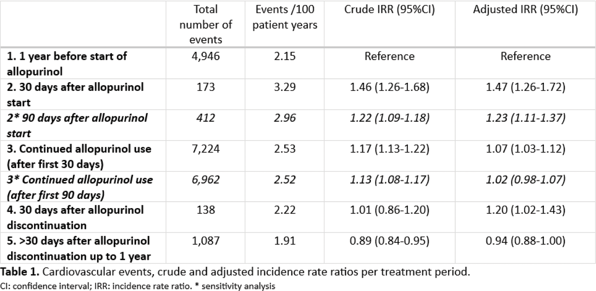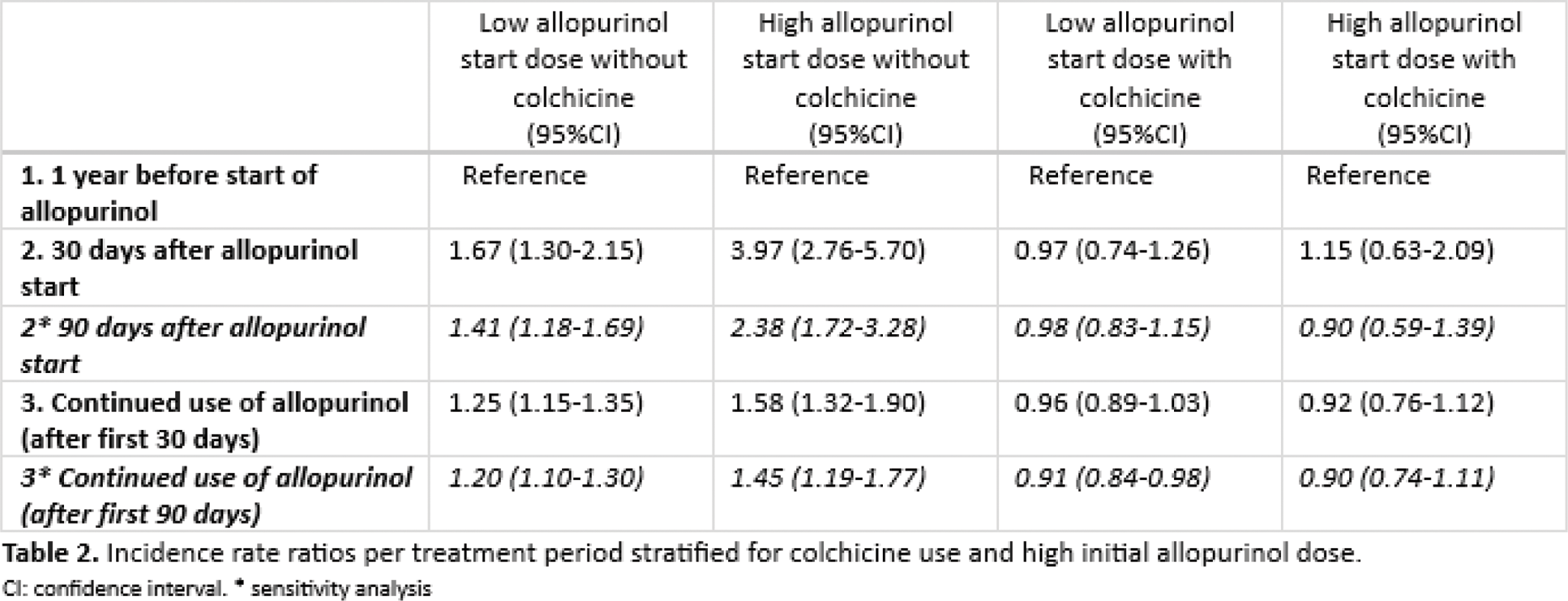 Results: Included were 84,582 patients (77% male, mean age 66 years (sd 13.4)), with 122,659 treatment episodes and 13,568 CV events. CV risk for periods 2, 3, 4 and 5 (reference period 1) were: 1.47 (95%CI 1.26-1.72), 1.07 (95%CI 1.03-1.12), 1.20 (95%CI 1.02-1.43), and 0.94 (95%CI 0.88-1.00) respectively (Table 1). The increased CV risk after starting allopurinol was dose-dependent (IRR: low dose 1.67; 95%CI 1.30-2.15; high dose 3.97; 95%CI 2.76-5.70) (table 2). This increase was fully countered by concomitant use of colchicine (IRR low dose allopurinol with colchicine 0.97; 95%CI 0.74-1.26, high dose allopurinol with colchicine 1.15; 95%CI 0.63-2.09) (table 2).