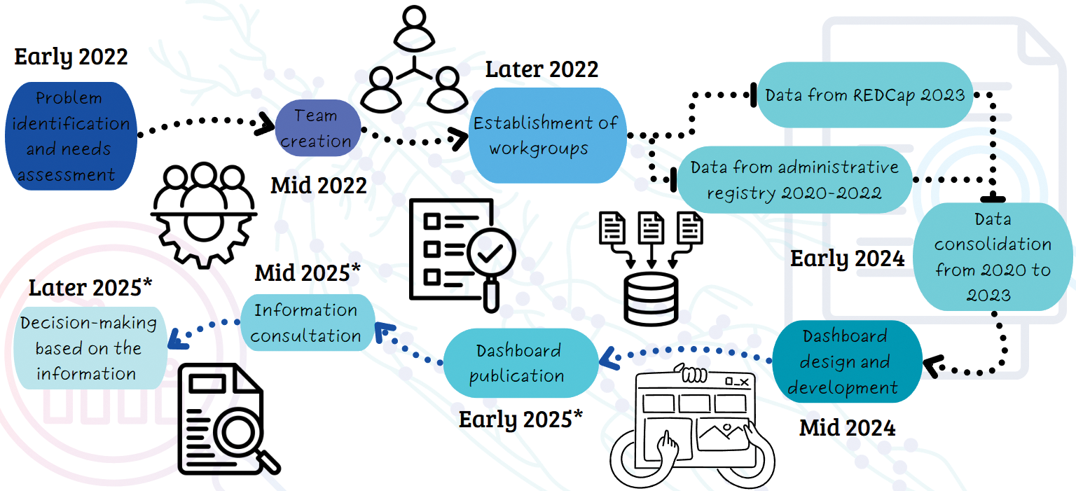 Timeline describing the process of creating and developing the dashboard and the plan for the future (2025*) at the rheumatology department of San Jose Hospital, in Bogotá Colombia.