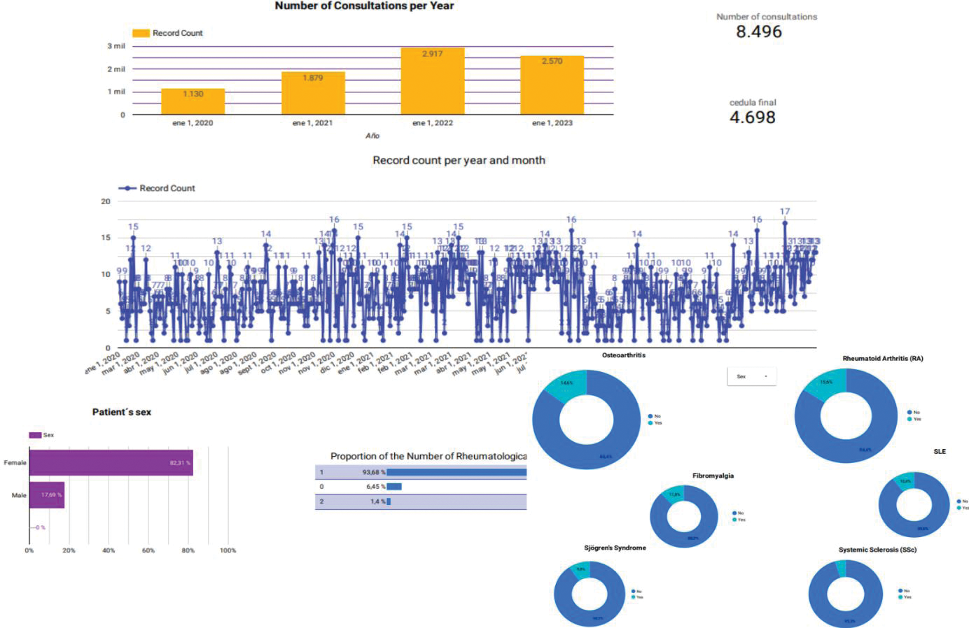 Methods: Rheumatology Department of a tertiary hospital. Methods: The dashboard was built using administrative records from the rheumatology department of the hospital. Two sources of information were identified, administrative sources (patient care billing records and variables from the administrative source, information of the billing system and the method of recordkeeping) from 2020-2022 and data from the RedCap® (Research Electronic Data Capture) software for 2023 from the Rheumatology Department of Hospital San José were used to create a dashboard. Similarly, clinical records maintained in the EMR system were revised, in compliance with Colombian law (Law 15 of 2020). This law states the criteria for the registration and storage of information in Colombia. The metrics were consultations per month (2020-2023), the number of patients attended, demographic characteristics of the population, ICD-10 (International Statistical Classification of Diseases and Related Health Problems), and the presence of comorbidities were prioritized for visualization. The dashboard was built using Looker Studio, with SQL (Structured Query Language) queries enabling real-time data analysis, Image 1.